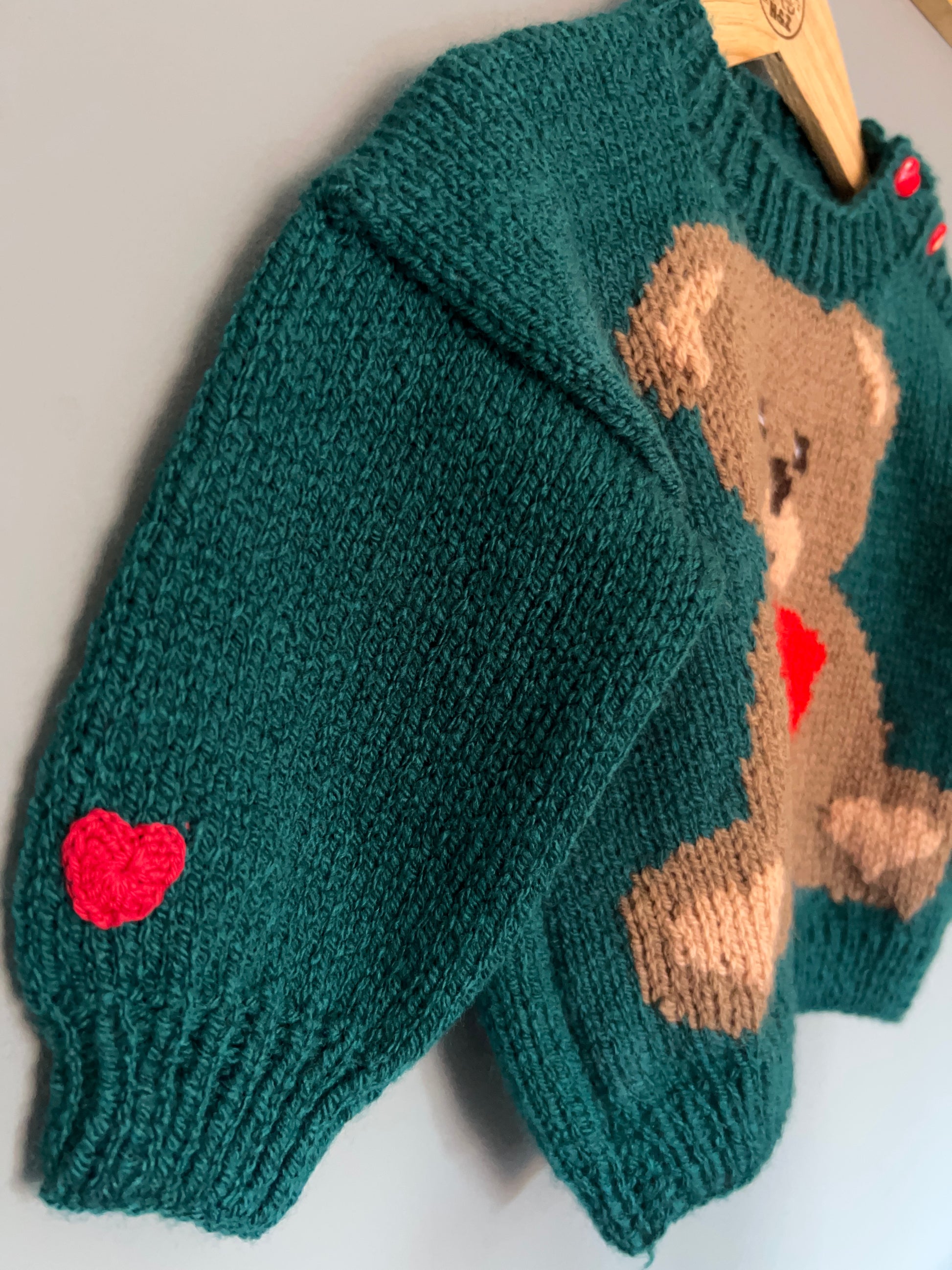 This beautiful jumper has a teddy bear cuddling a heart and appliqués Big Hug added to that back. Little heart appliqués are also added to the back of the jumper.